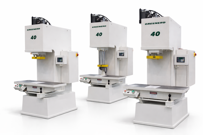 This trio of presses is based on our standard bench press model. Modified with the extended tables and custom tooling mounting patterns. These straightening presses use a joystick control to apply 5-100% of nameplate tonnage. The range of tonnage available to the joystick can be limited by digital setpoints, giving finer control and improving safety.